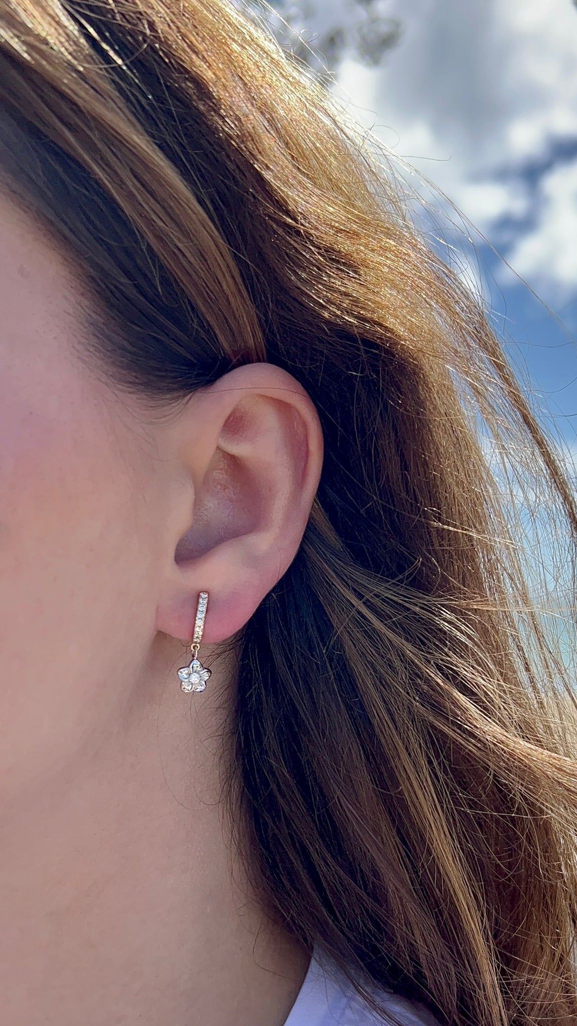 The model is wearing a similar Half Hoop Earrings with 18K White Gold Dangle Plumerias with .05ct Diamonds [ER40-18YD-WPD-V]. Shown for size on ear reference.