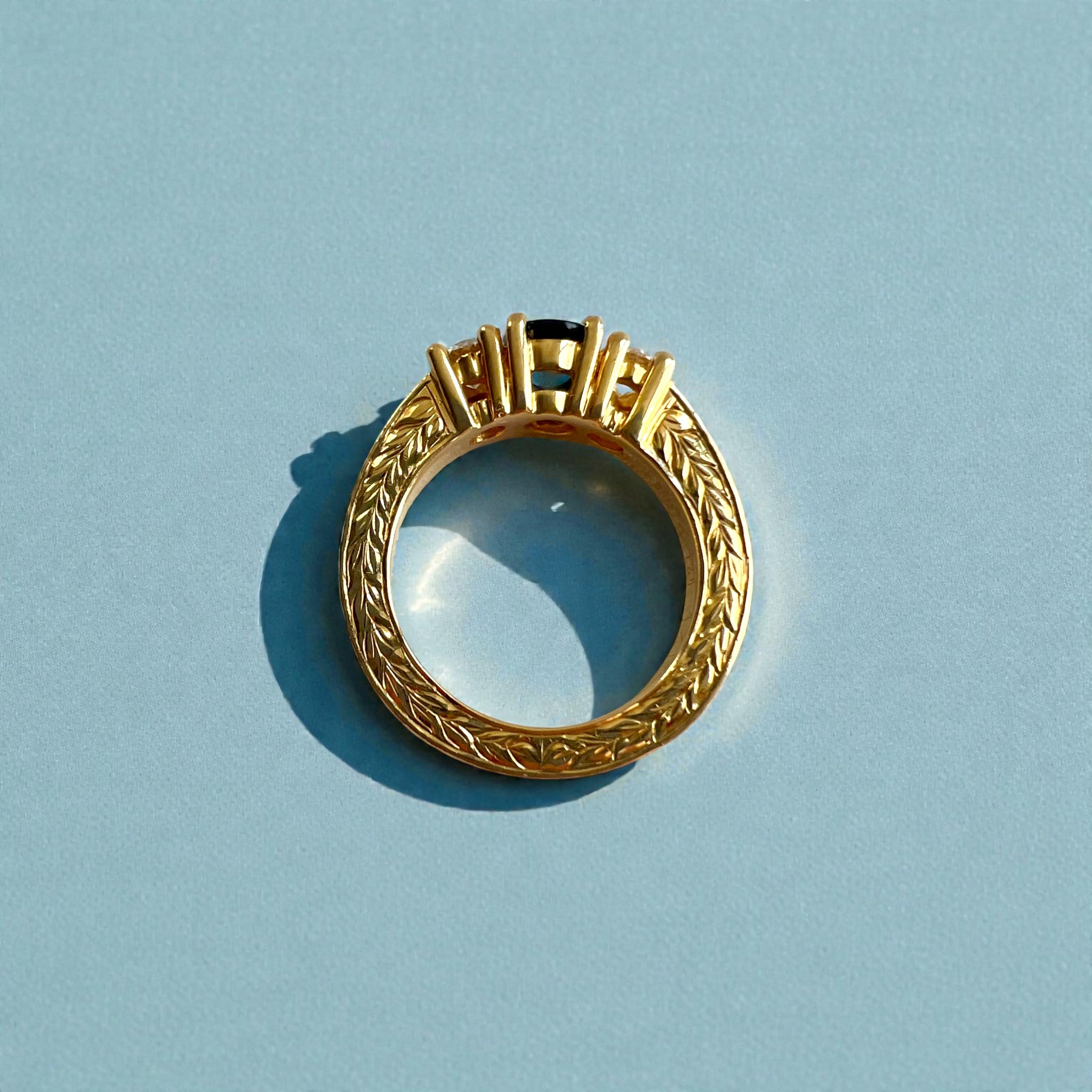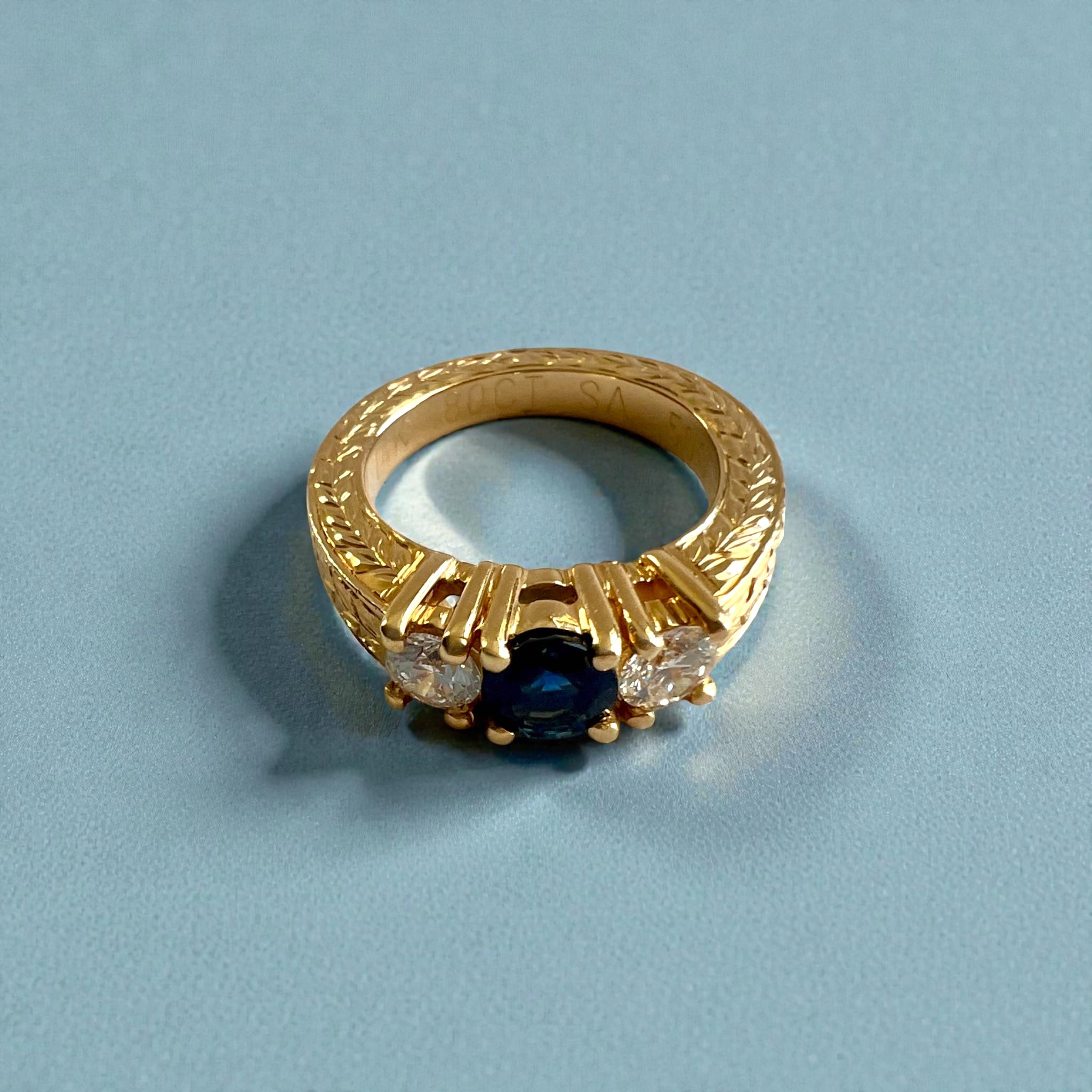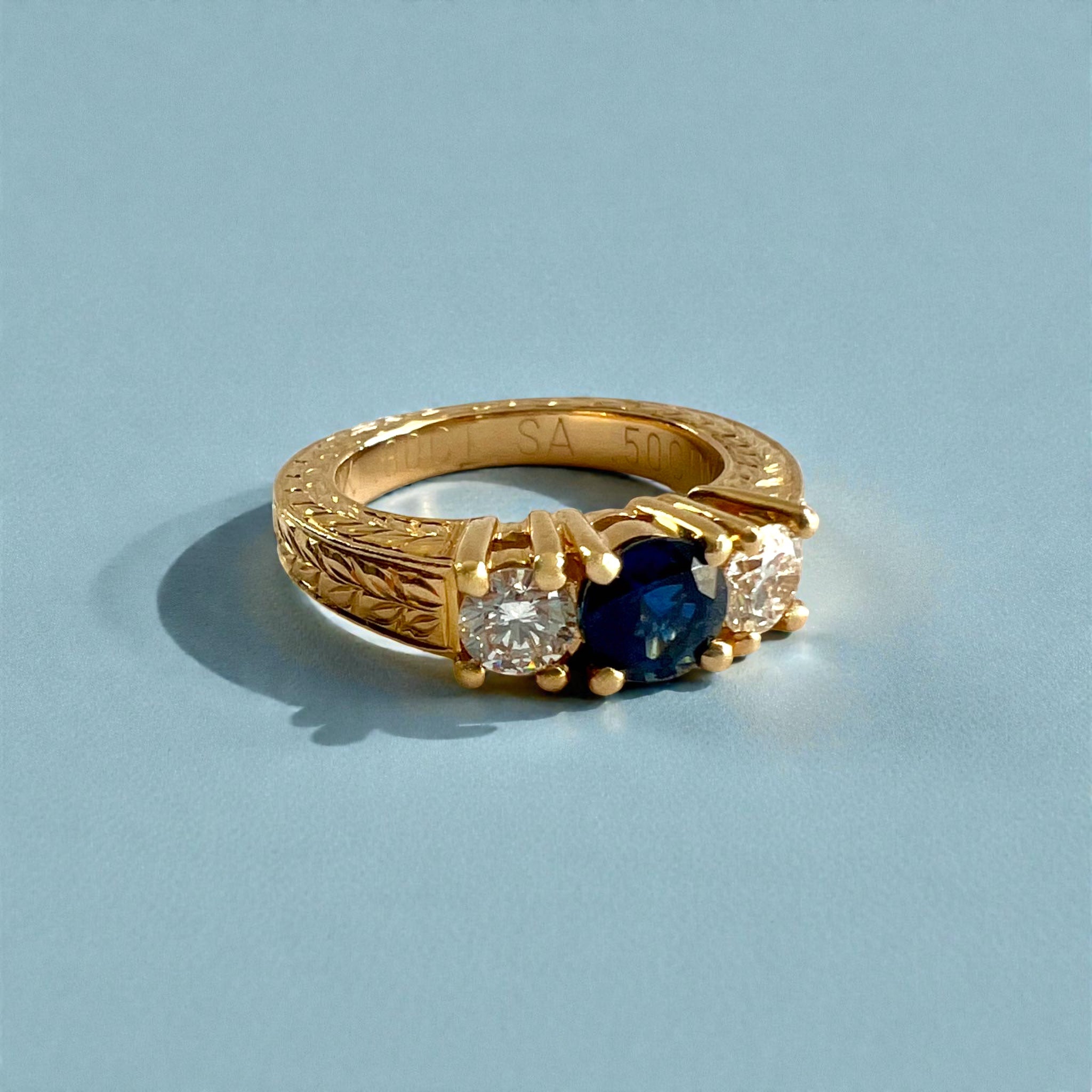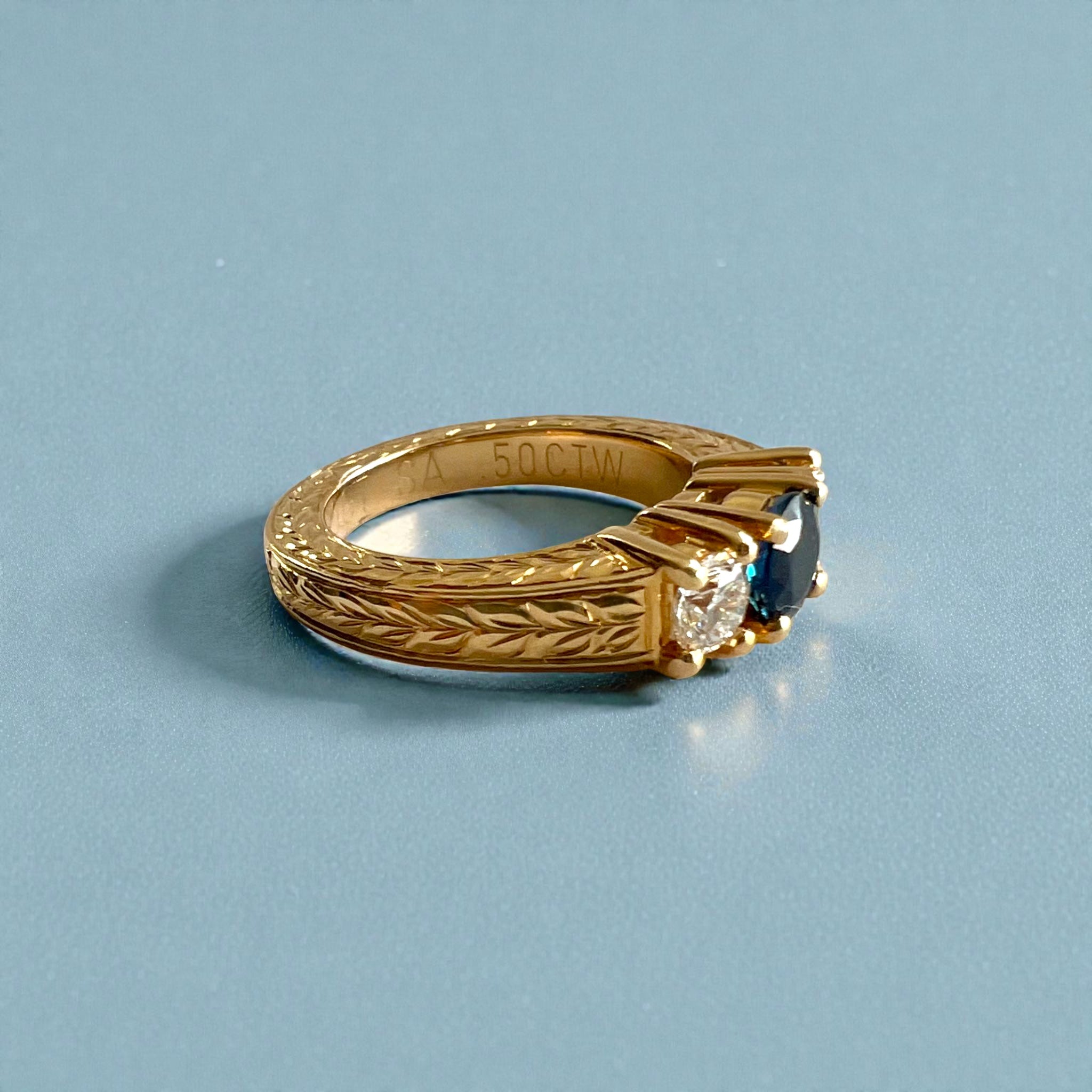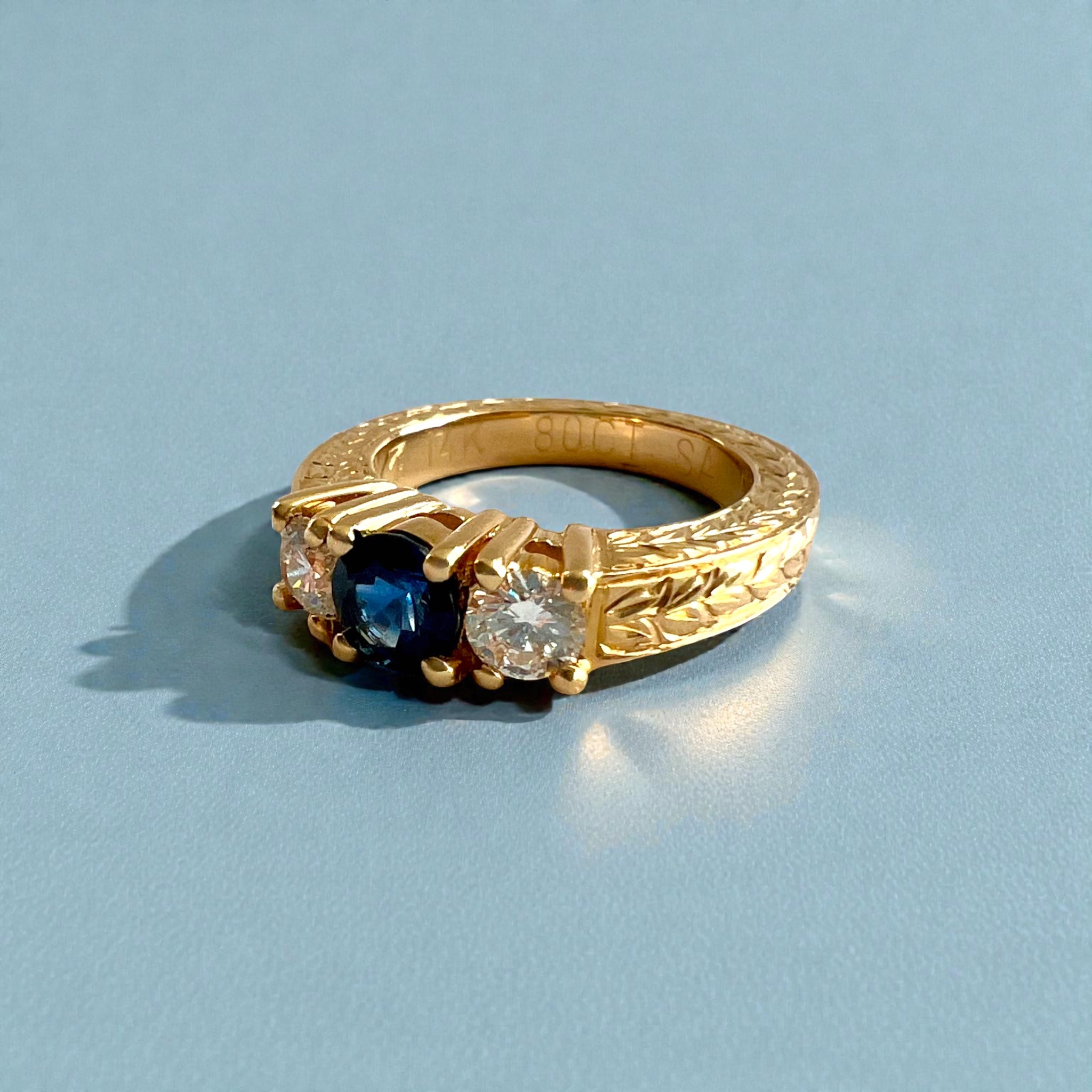 Tapered, approximately 4mm (down to 3mm) flat ring. Maile leaf design with .80ct Blue Sapphire with 2x .25ct Diamonds (VVS/F-G).