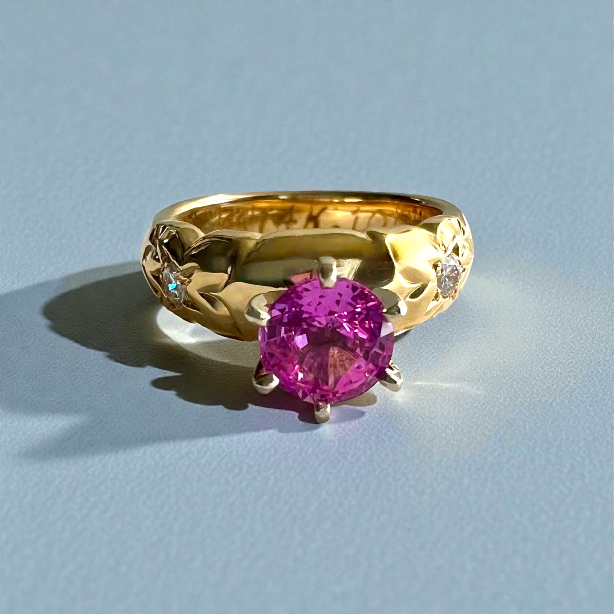 Tapered, 6mm (top), 4mm (bottom) barrel ring with 1.15ct Pink Sapphire and 2 x .05ct Diamonds in side Hibiscus flowers. Plain band.