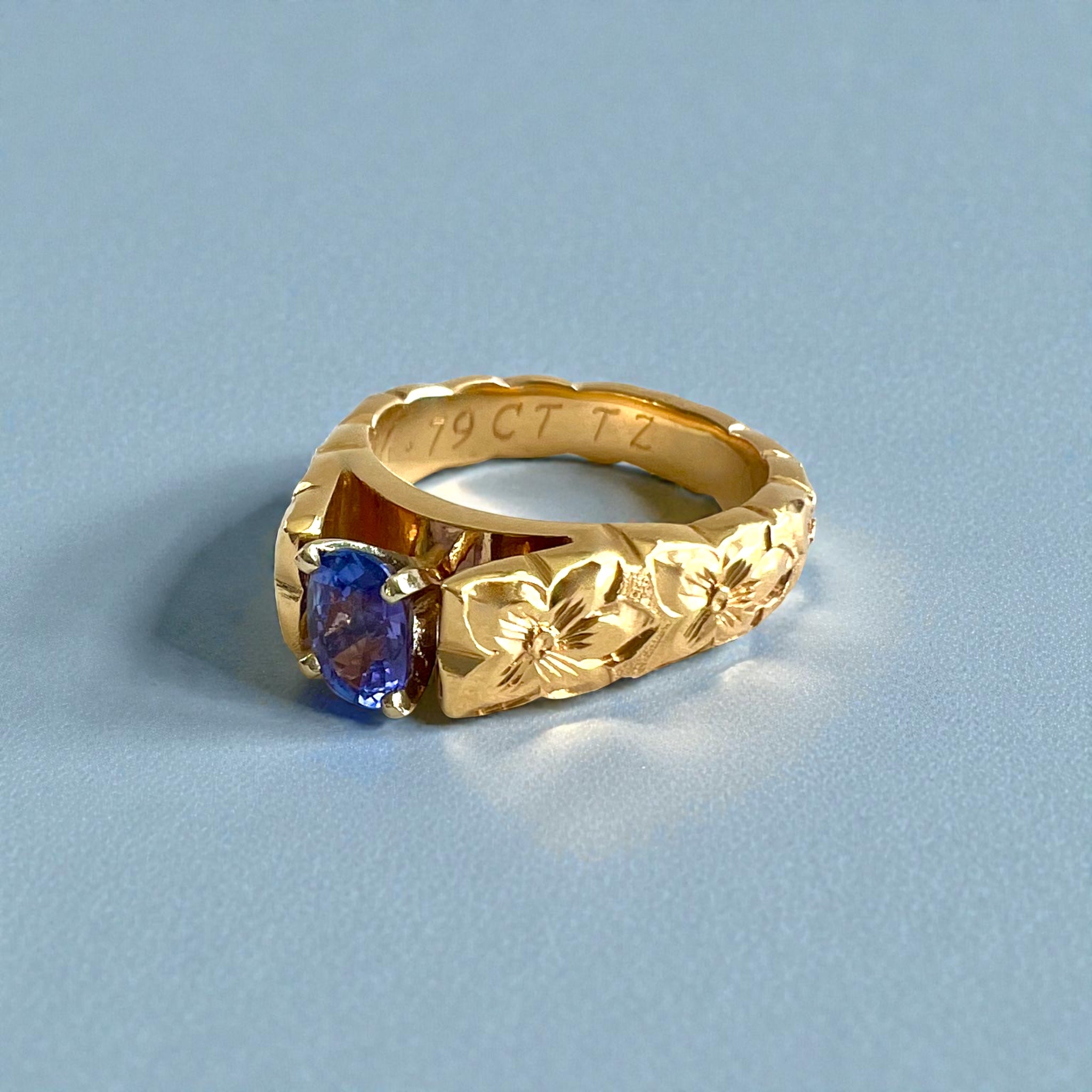 Barrel, 6mm tapered ring. Scalloped Hibiscus flowers all around design on polka dot background with .79ct Oval Tanzanite.
