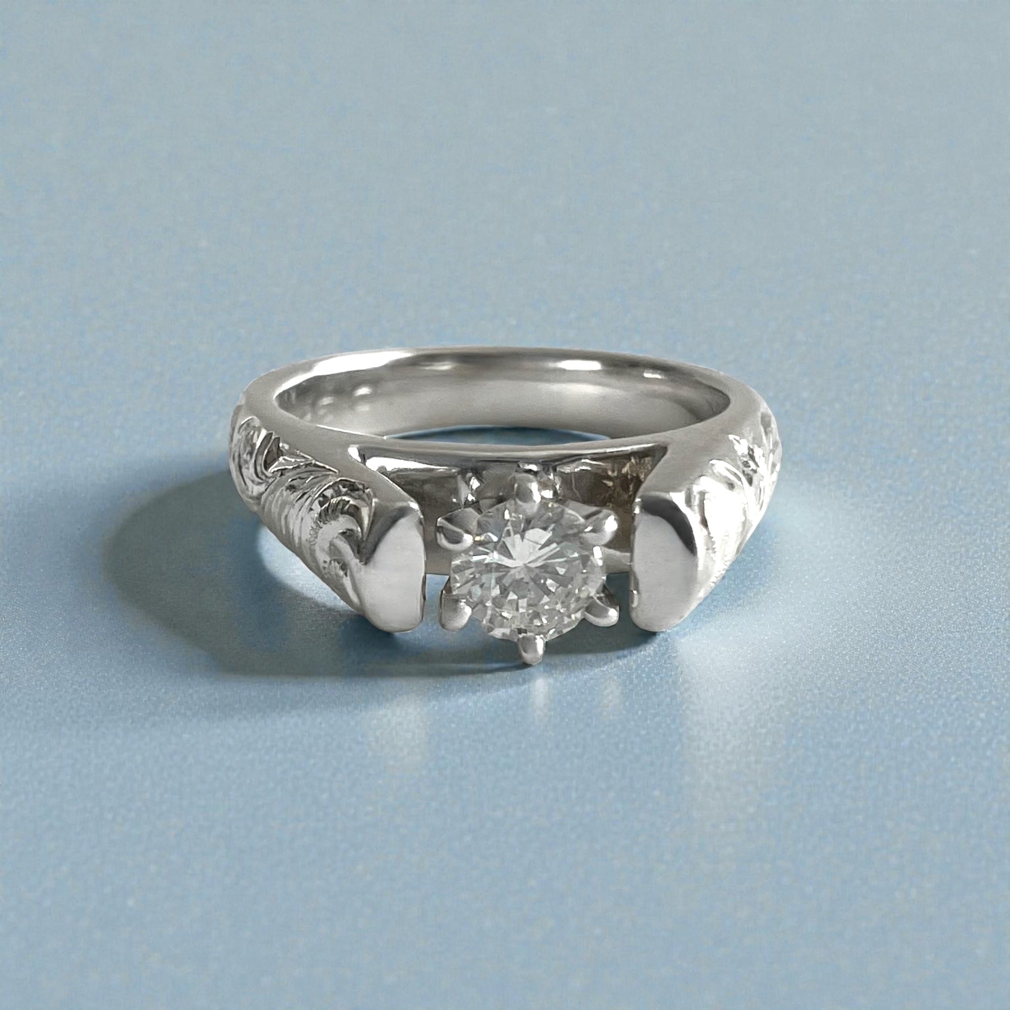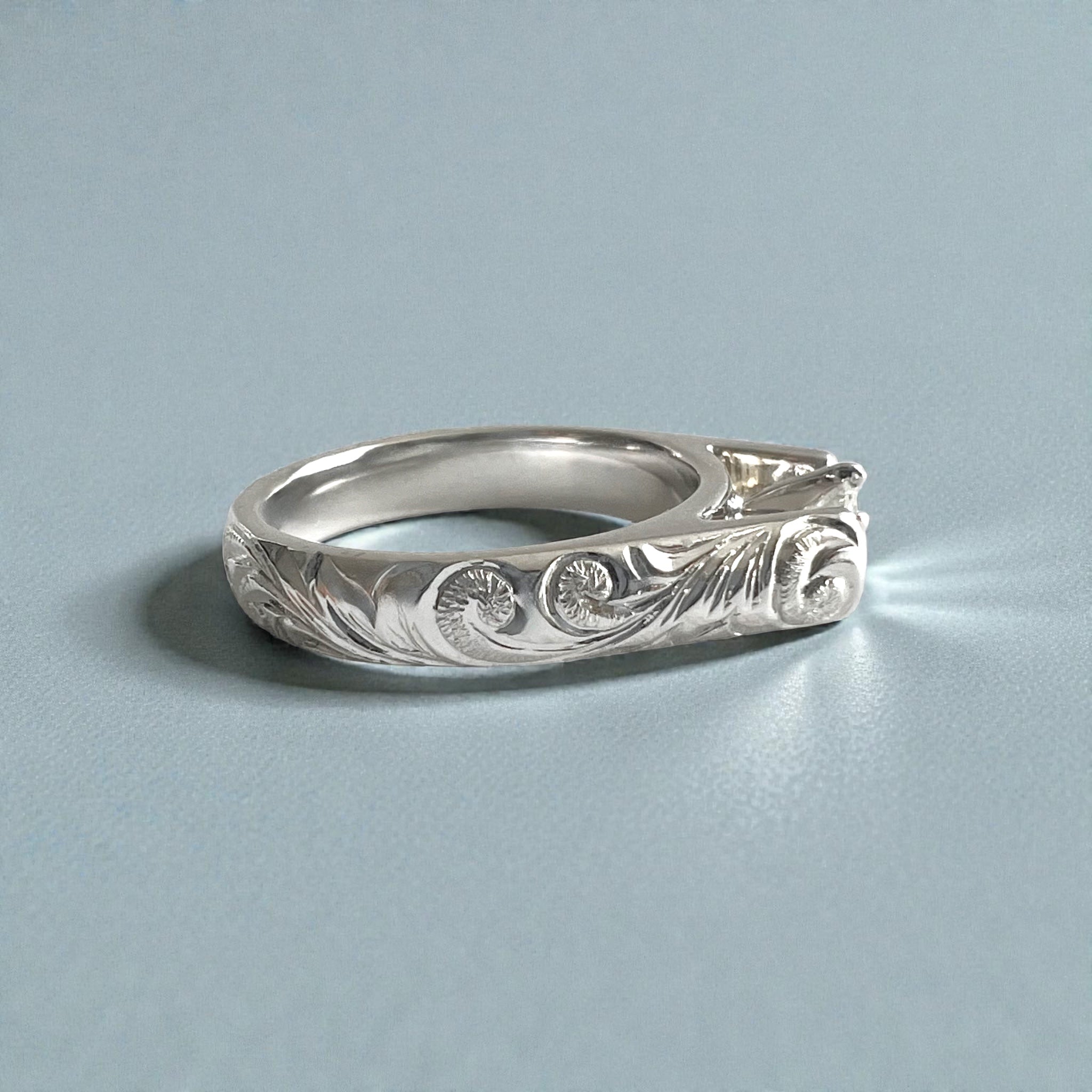 Barrel, 4mm wide ring. Old English & 1x Hibiscus design with .25ct Diamond (VS F/G).