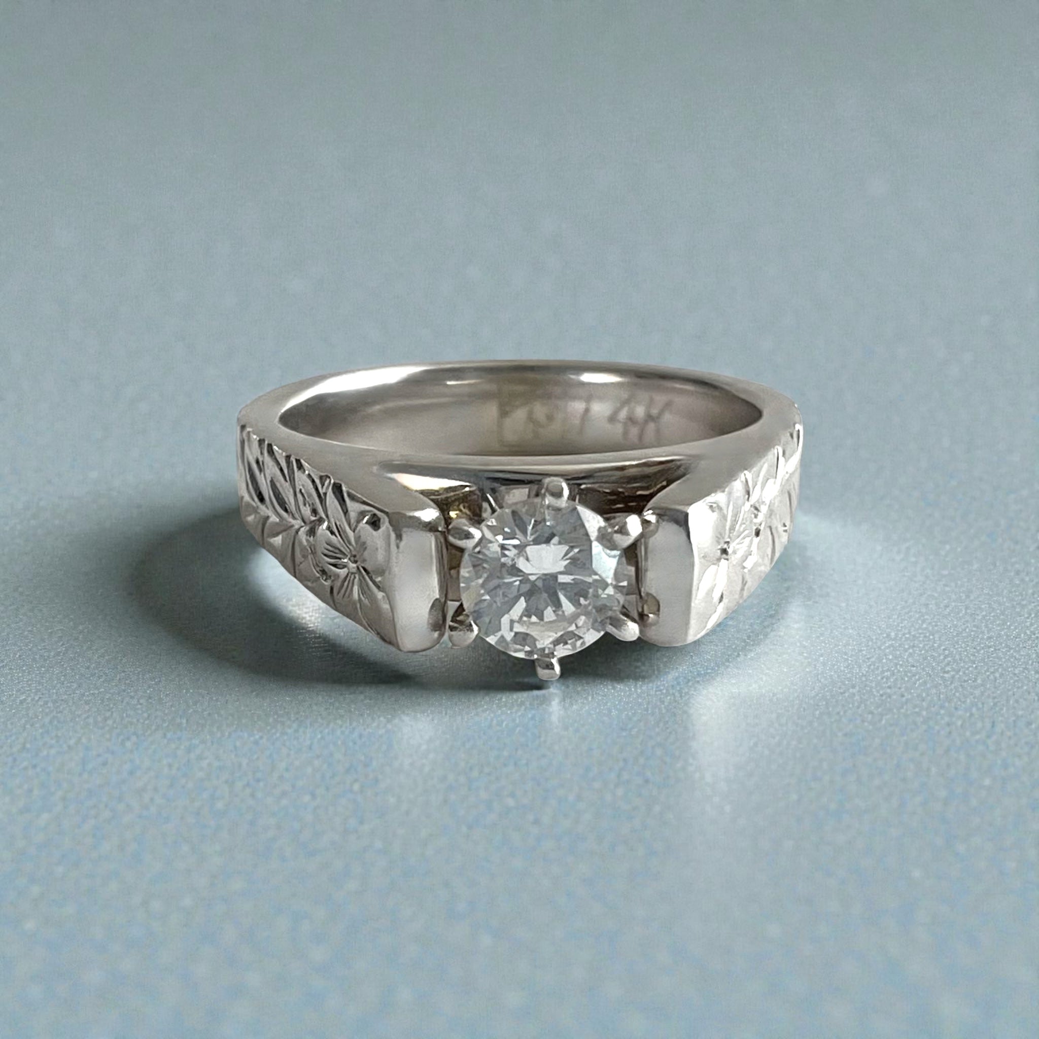 Shiny Maile & Hibiscus 4mm French Mount Solitaire Flat Ring w/ 4.4mm Cubic Zirconia in 14K White Gold
