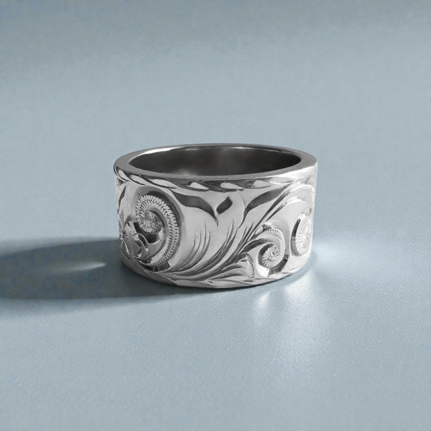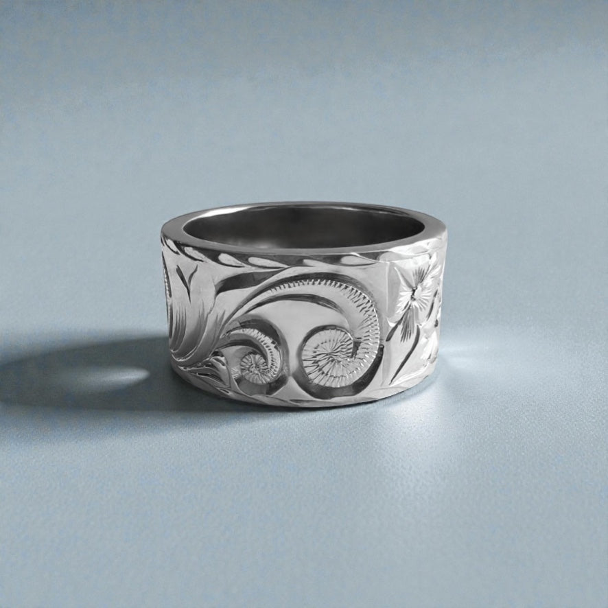 Flat, 10mm wide ring. 2x Hibiscus Kiss design with Old English. Rope border.