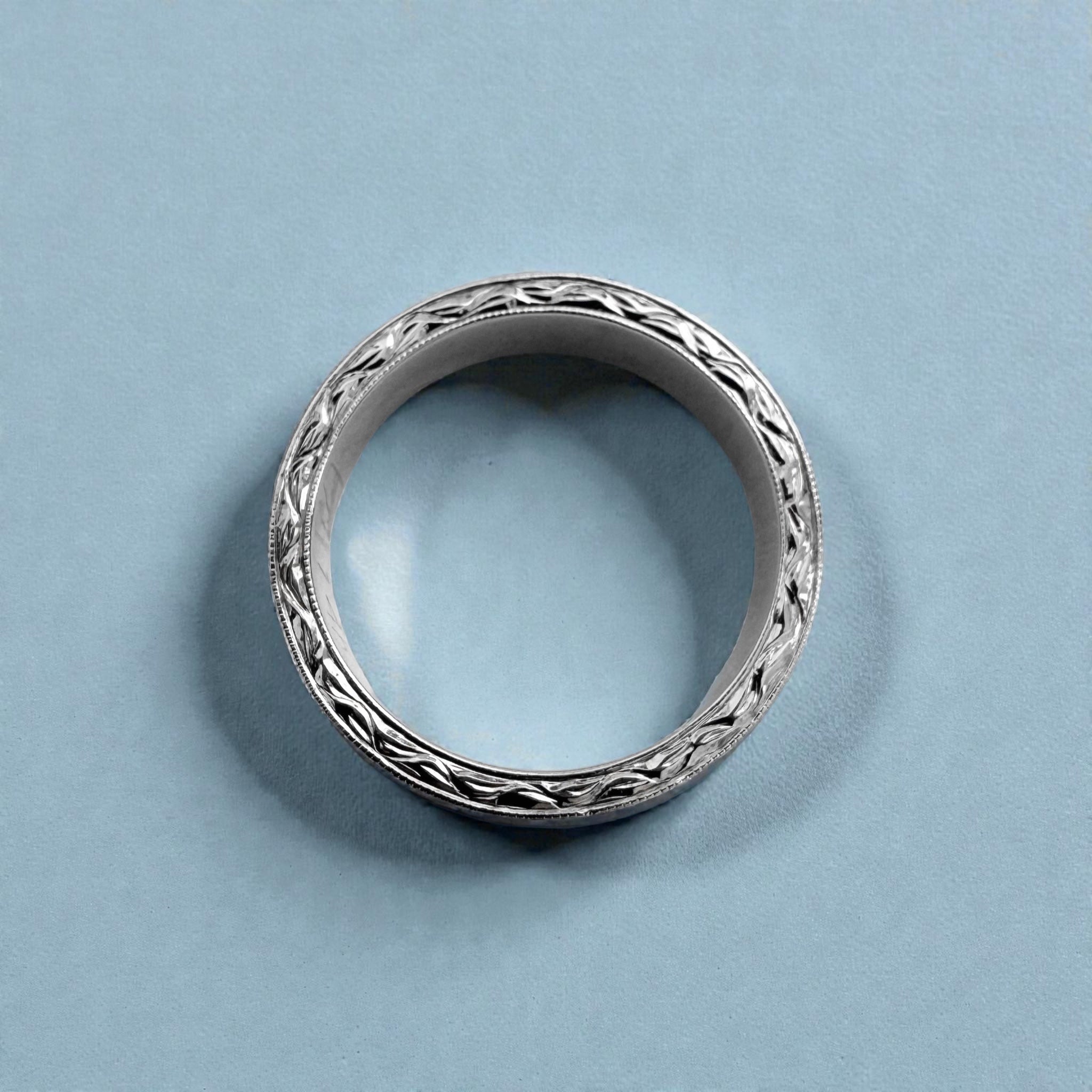 Flat, 4mm wide ring. Shiny Maile design with 1x Hibiscus and 1x Plumeria. Milgrain border.