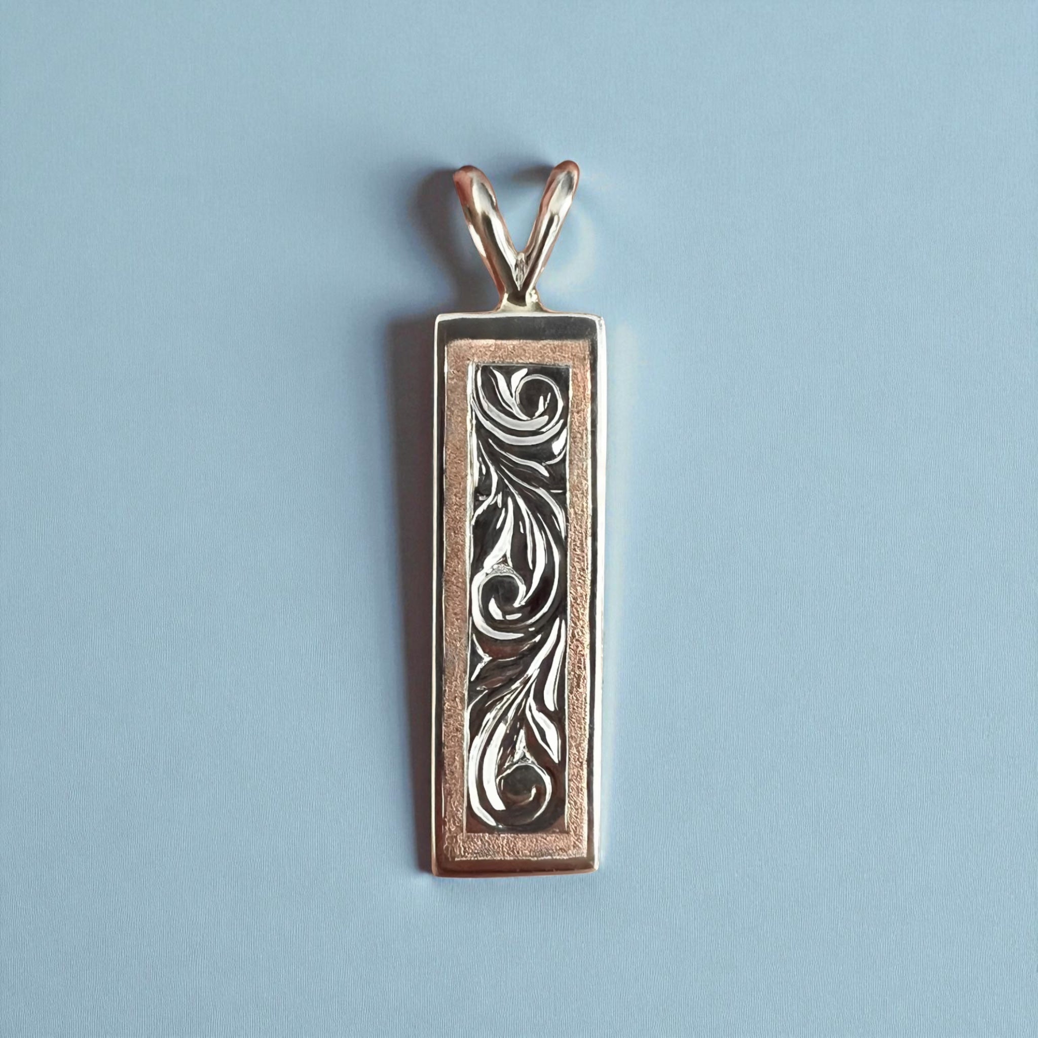 Two-tone Hawaiian pendant with Old English design in 14K White Gold with 14K Pink Gold border. Approximately 8mm x 1" in length (w/o bail). Plain border. Plain on the back.