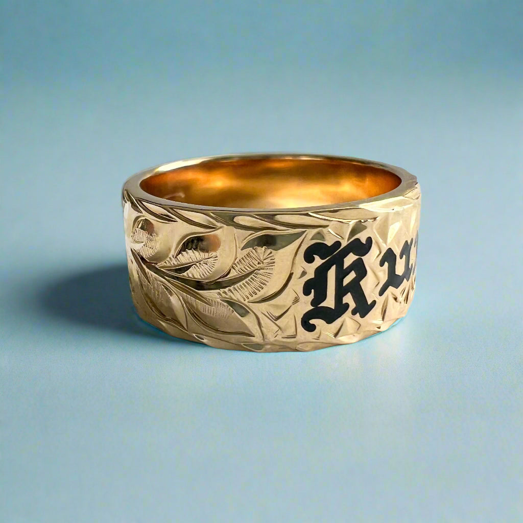 Flat, 10mm wide ring. Maile & 1x four-petal Hibiscus design with traditional black enamel "Kuuipo" ("Sweetheart" in Hawaiian) on chip chop background. Rope border.