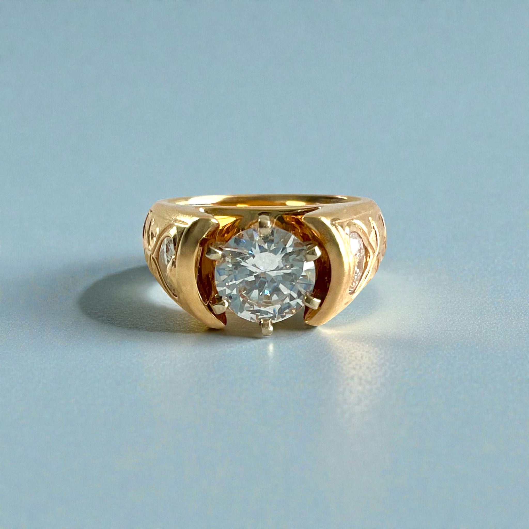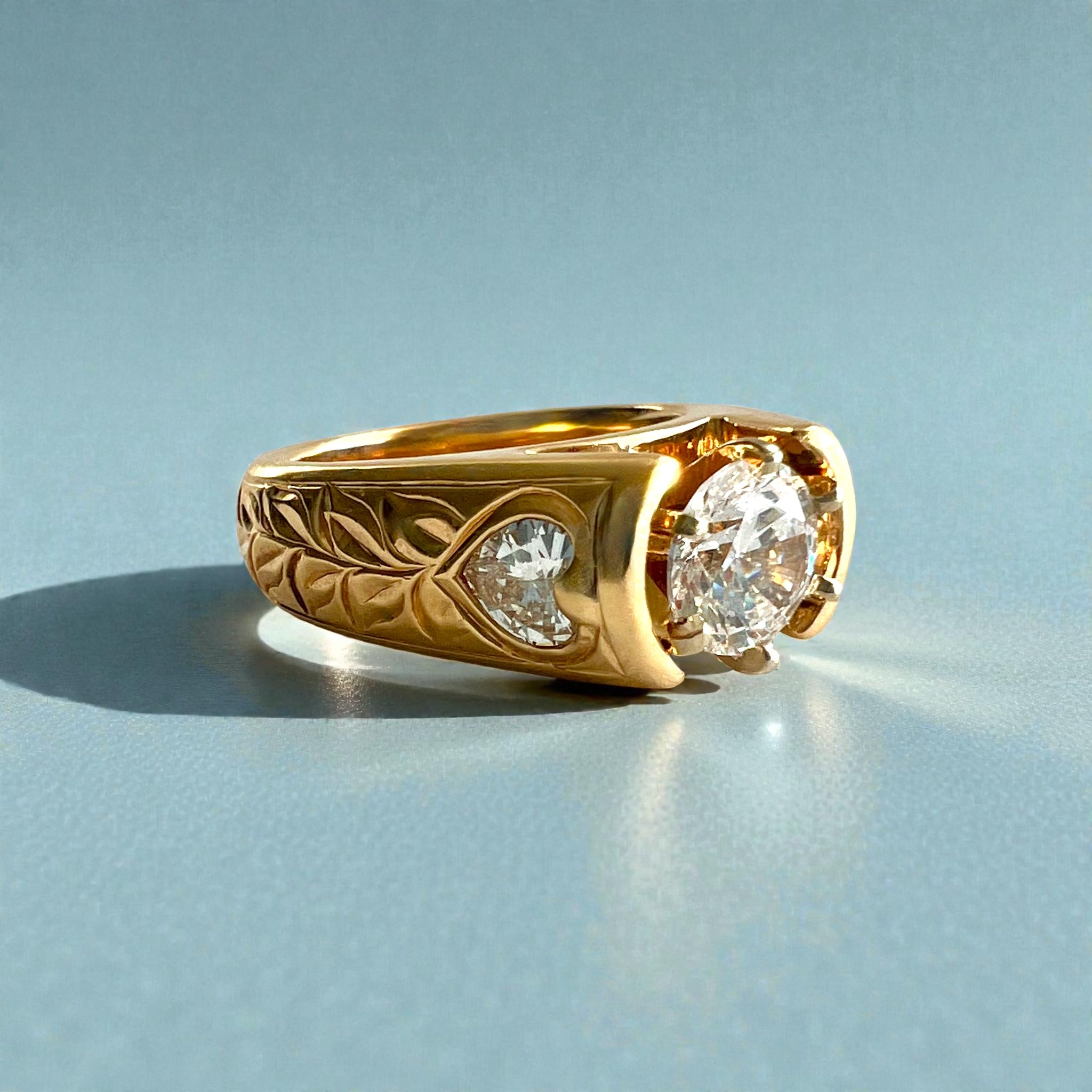 Barrel, 8mm tapered ring. Shiny Maile design with 6.5mm Round Cubic Zirconia (the size of Cubic Zirconia corresponds to approx. 1 ct Diamond) and 2 x 0.24 ct heart shape diamonds (VS/F-G). Plain border. Sizing bar.