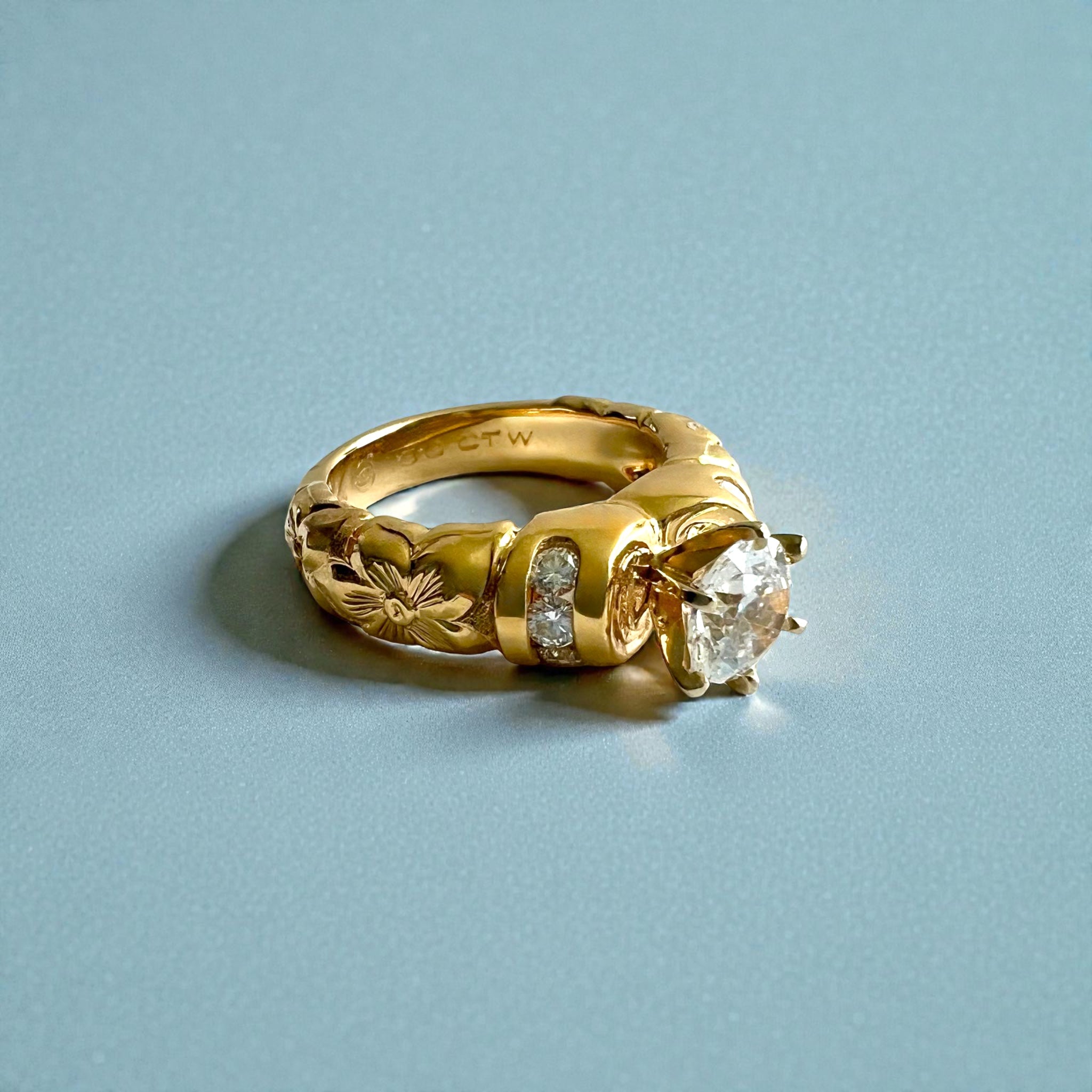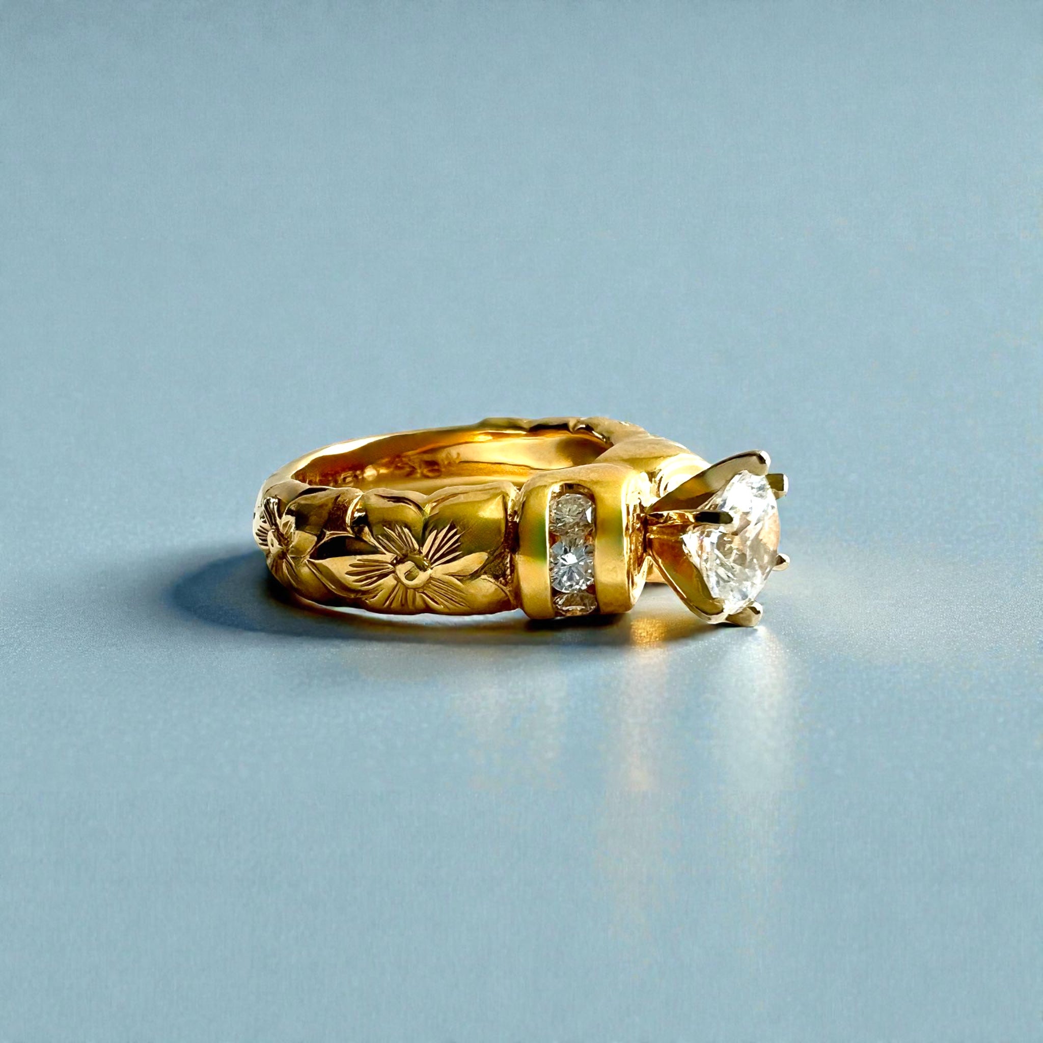 Tapered, approx. 7mm (top), 4mm (bottom) barrel ring with 6.4mm Cubic Zirconia (the size of Cubic Zirconia corresponds to approx. 1ct Diamond) and 6x .05ct (.30ctw) channel style set Diamonds. Two scalloped Hibiscus flowers (four in total) on each side.