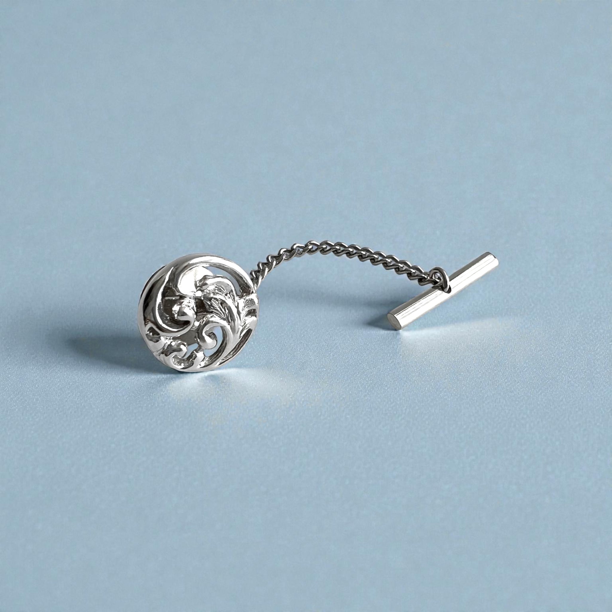 Filigree scroll Tie Tac with chain in 14K White Gold