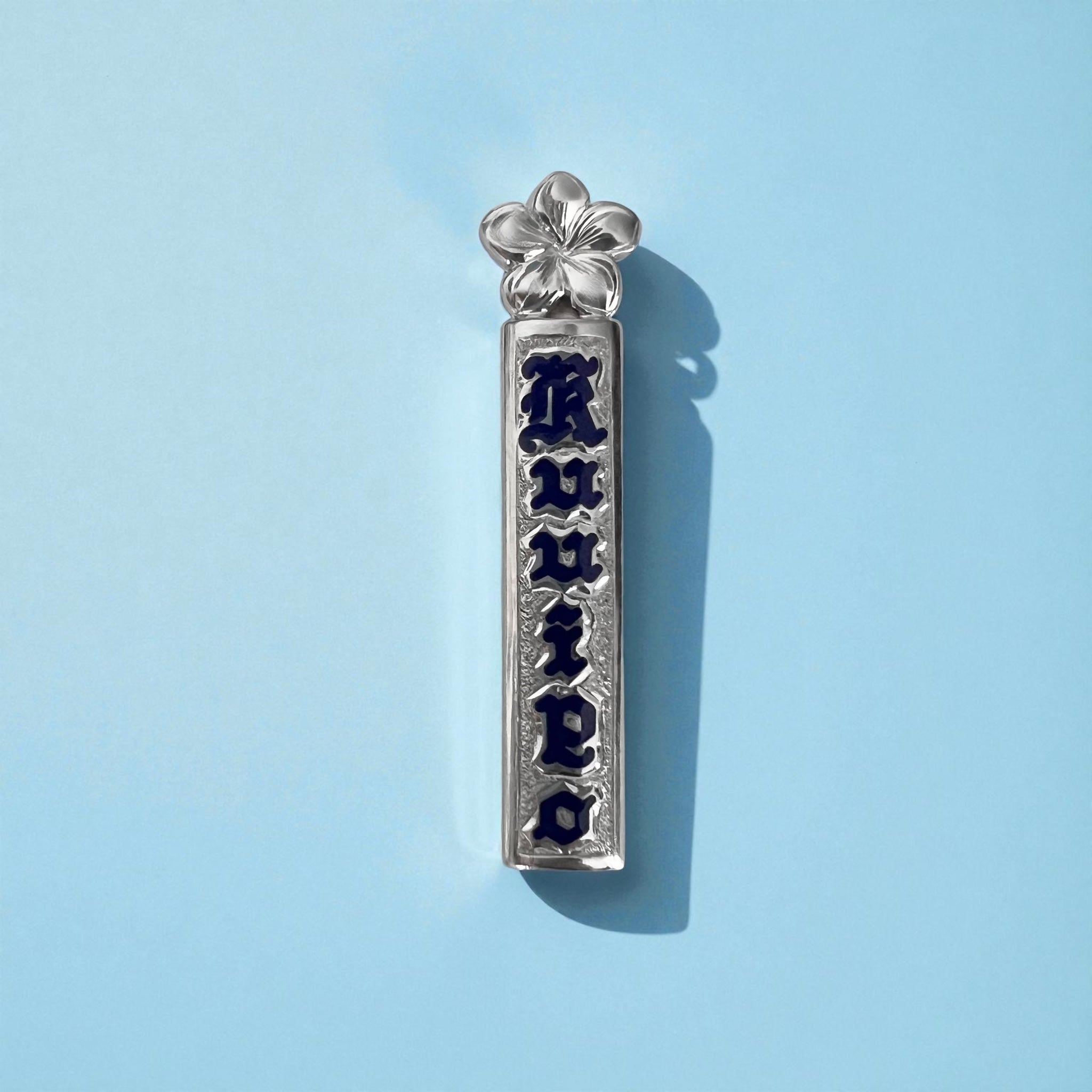 Plumeria on top pendant with "Kuuipo" ("Sweetheart" in Hawaiian) in signature cobalt blue enamel on polka dot background. Approx. 6mm x 1" in length (measured without the flower). Plain border. Plain on the back.