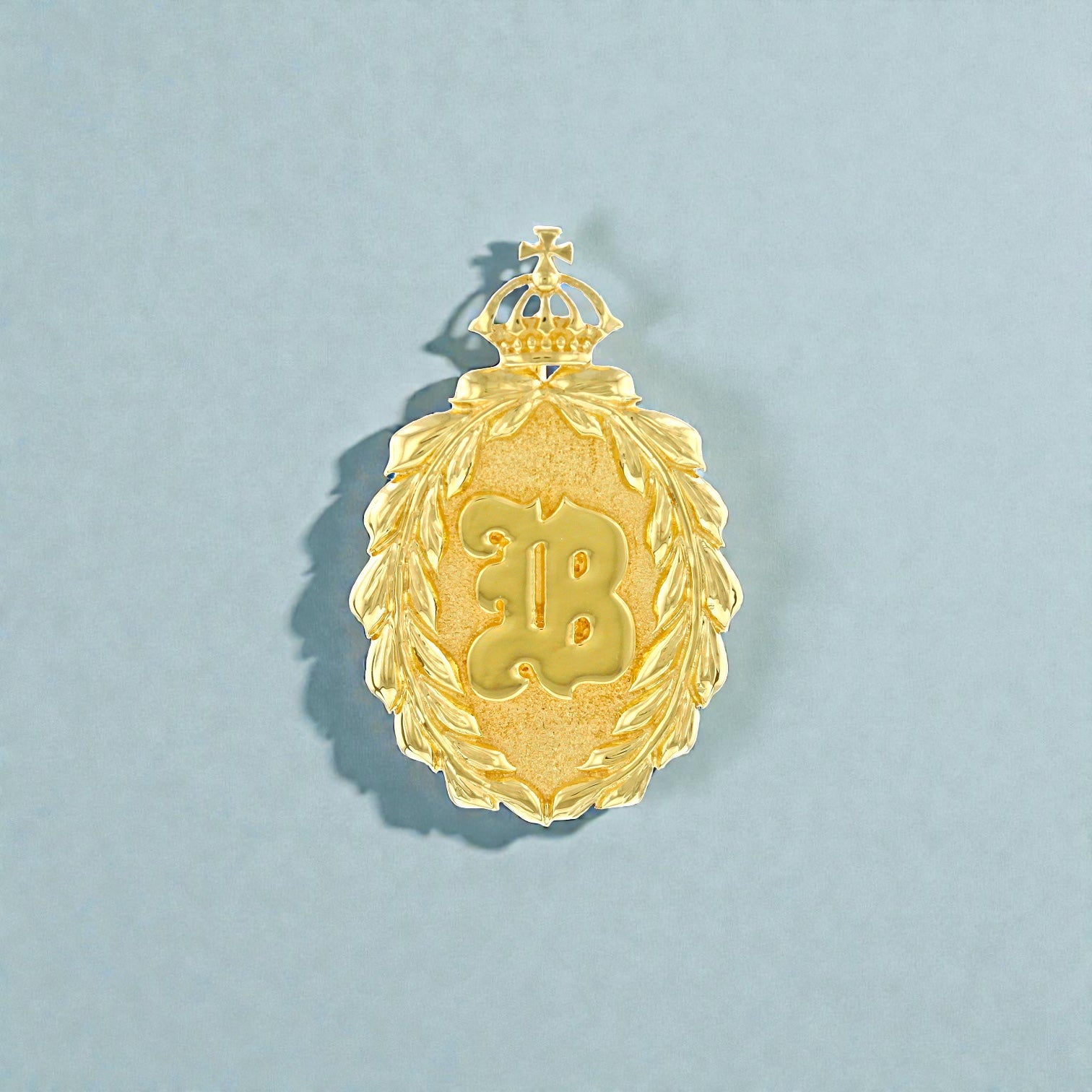 Back of Iolani Palace Oval Maile Pendant w/ Raised Initial "B" in 14K Yellow Gold