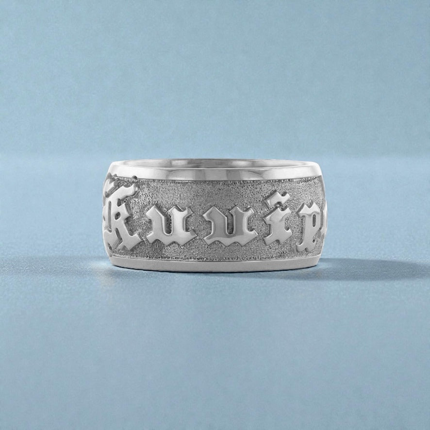 • Load image into Gallery viewer, Raised Old English and Plumeria 10mm "Kuuipo" Ring in 14K White Gold in size 8 1/2