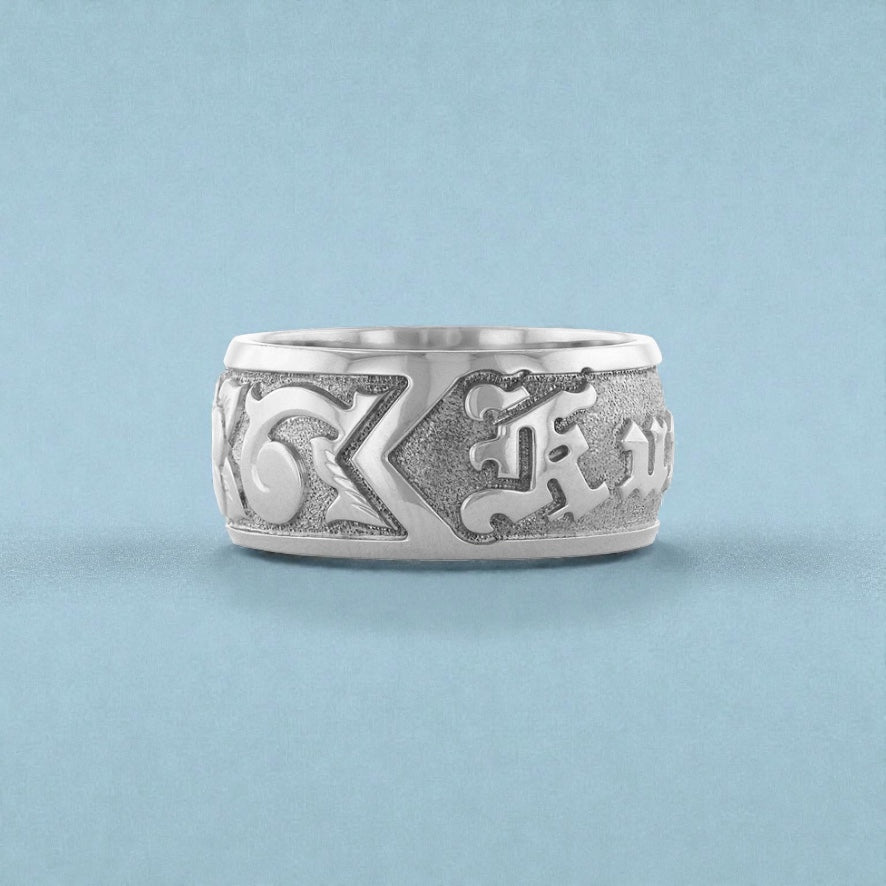Raised Old English and Plumeria 10mm "Kuuipo" Ring in 14K White Gold in size 8 1/2